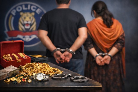 கோவை சிங்காநல்லூர், அக்ரக ஹாரம் வீதியில் வசிப்பவர் சங்கர சுப்பிரமணியன் ( வயது 70) இவரது மனைவி கல்பனா ( வயது 68) ஓய்வு பெற்ற அரசு ஊழியர். சம்பவத்தன்று இவர்கள் தனது வீட்டை பூட்டிவிட்டு வெளியூர் சென்றிருந்தனர். திரும்பி வந்து பார்த்தபோது பீரோவில் இருந்த 18 பவுன் தங்க நகைகளை காணவில்லை. யாரோ திருடி சென்று விட்டனர் . இது குறித்து சிங்காநல்லூர் போலீசில் புகார் செய்யப்பட்டது. போலீசார் வழக்கு பதிவு செய்து விசாரணை மேற்கொண்டனர். அங்கு பொருத்தப்பட்டிருந்த கண்காணிப்பு கேமராவில் பதிவான காட்சிகள் ஆய்வு செய்துள்ளனர். தொடர்ந்து நடத்திய விசாரணையில் அந்த வீட்டுக்கு சலவை செய்யும் வேலை செய்து வந்த ஒண்டிப்புதூர் நெசவாளர் காலனியை சேர்ந்த மகாகிருஷ்ணன் அவரது மனைவி ஜான்சி ஆகியோர் நகையை திருடியது தெரிய வந்தது. இதையடுத்து அவர்களை போலீசார் கைது செய்து விசாரணை நடத்தினர். துணியை சலவைக்கு போட்ட போது அதில் வீட்டு சாவி இருந்ததை வீட்டின் உரிமையாளர் சங்கர சுப்பிரமணியன் கவனிக்கவில்லை. அதனை சாதகமாக பயன்படுத்தி அந்த சாவி எடுத்துக் கொண்ட மகா கிருஷ்ணன், அவரது மனைவி ஜான்சி ஆகியோர் சந்தர்ப்பம் கிடைக்கும் போது சாவியை பயன்படுத்தி திருடி கொள்ளலாம் என்று எண்ணி இருந்தனர். அப்போதுதான் சங்கர சுப்பிரமணியன் மனைவியுடன் வெளியூர் சென்றதை அறிந்த மகா கிருஷ்ணன் -ஜான்சி தம்பதியினர் வீட்டை திறந்து பீரோவில் இருந்த மோதிரம் வளையல், செயின் மற்றும் வைர நகை என 18 பவுன் நகைகளை திருடியதை ஒப்புக்கொண்டனர். அவர்களிடமிருந்த நகைகள் பறிமுதல் செய்யப்பட்டது. இருவரும் நீதிமன்றத்தில் ஆஜர்படுத்தப்பட்டு சிறையில் அடைக்கப்பட்டனர்.