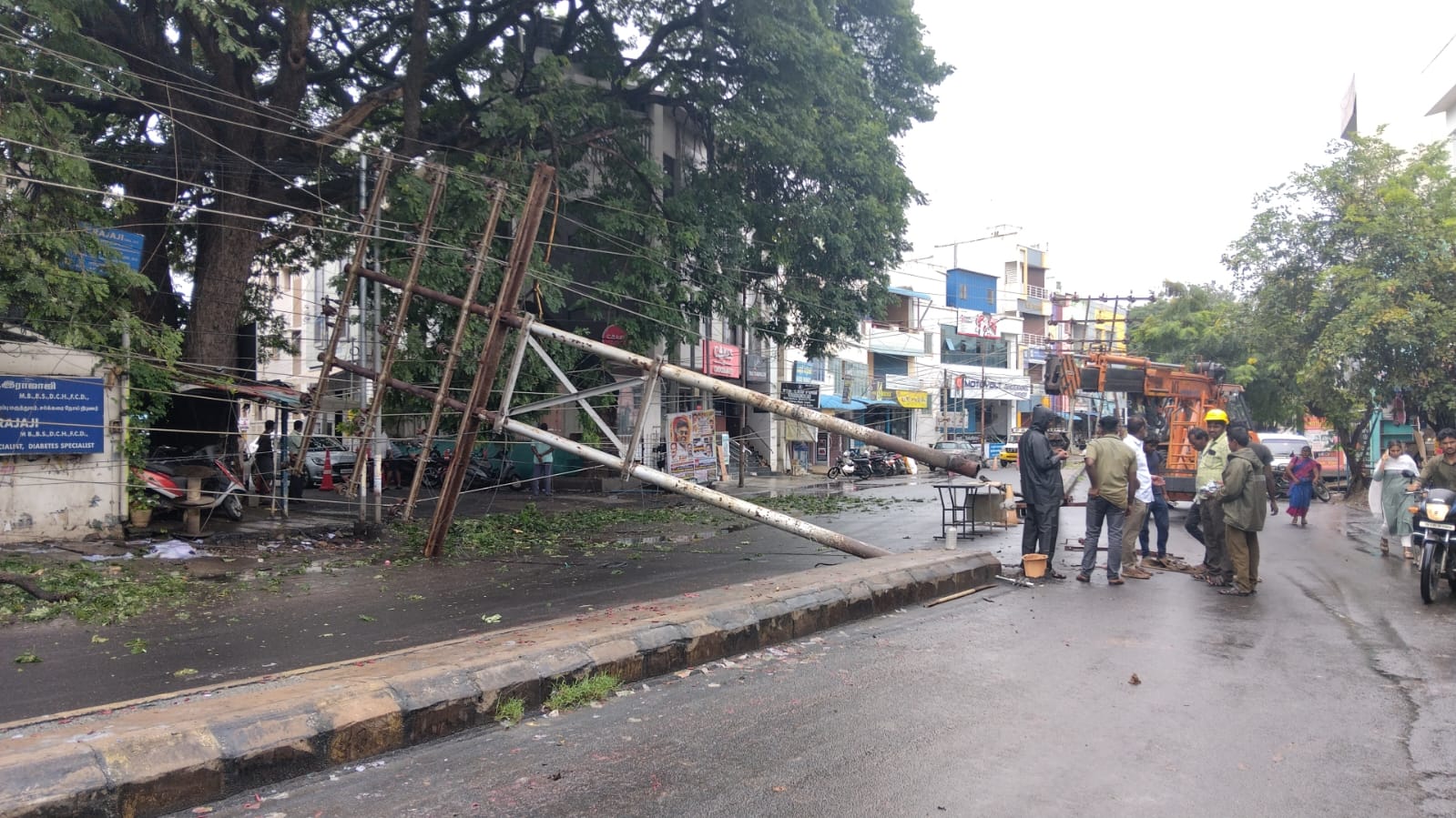 கோவையில் கார் மோதி மின் கம்பம் உடைந்து விழுந்தது