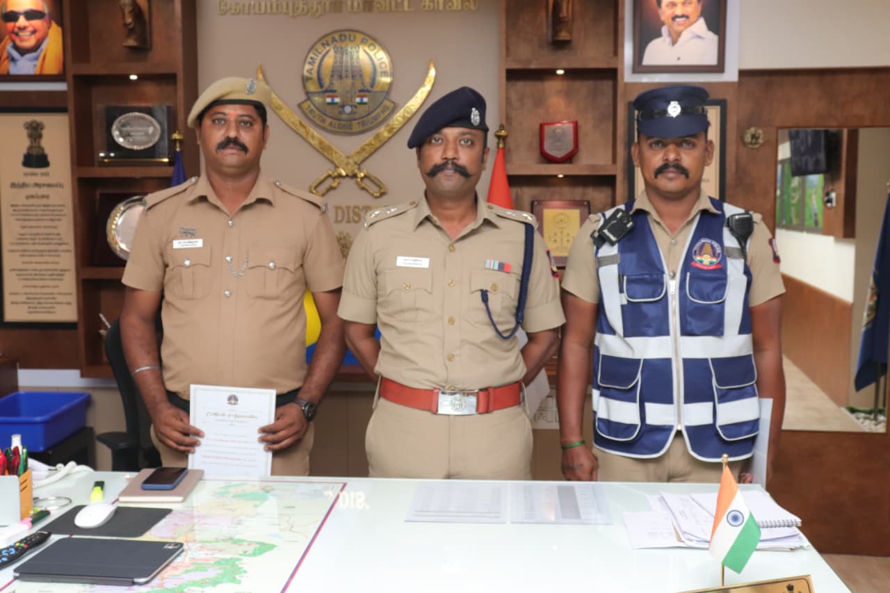 முருகேசன் (36) என்பவரை துரிதமாக செயல்பட்டு பிடித்த ரோந்து காவலர் தாமோதரன், மற்றும் ஏட்டுகோவிந்தராஜ்ஆகியோர்களை மாவட்ட காவல் கண்காணிப்பாளர்டாக்டர். கார்த்திகேயன் மாவட்ட காவல் அலுவலகத்திற்குவரவழைத்து பாராட்டி, பாராட்டு சான்றிதழ்கள் வழங்கினார்.