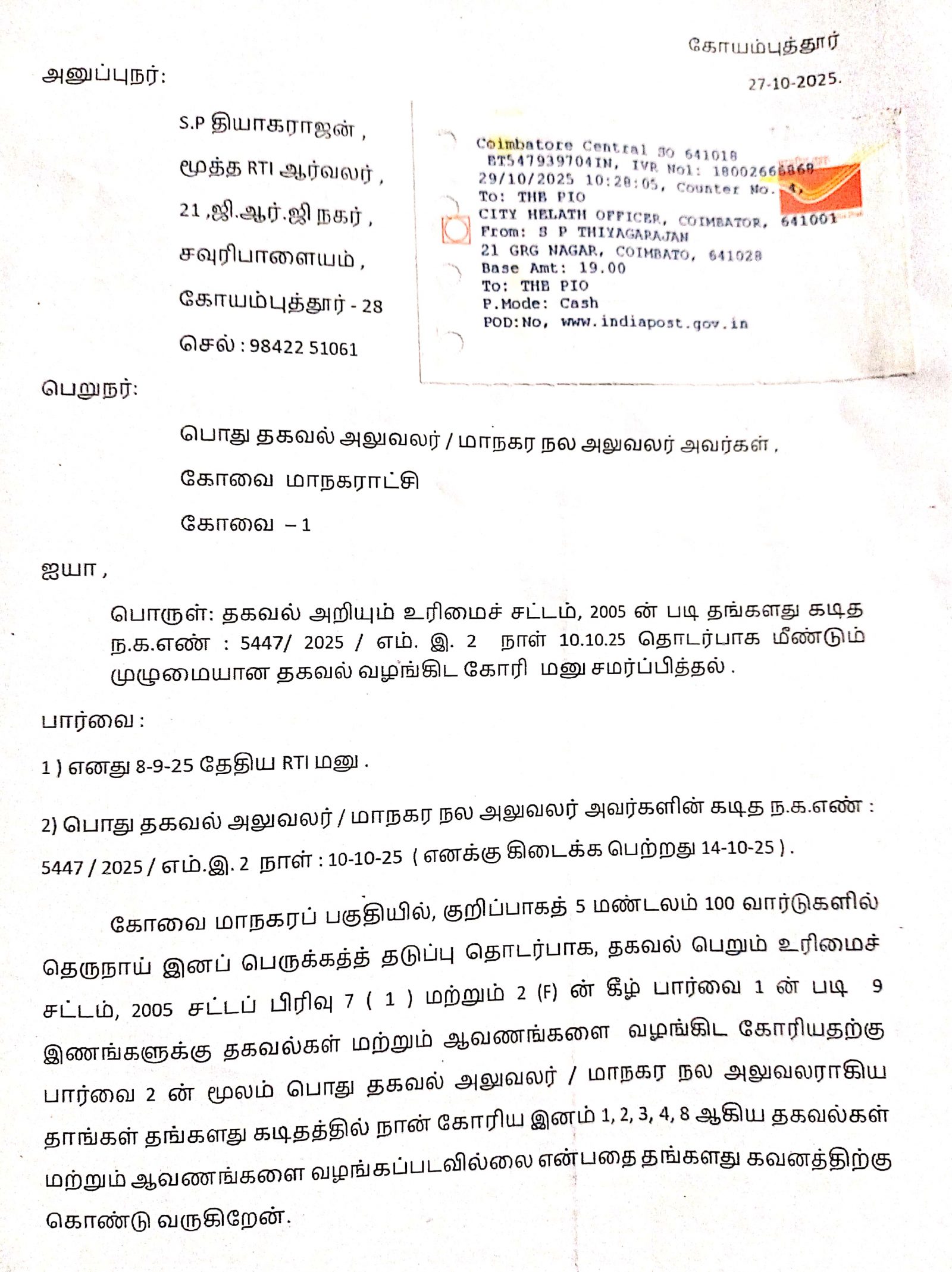 கோவை மாநகராட்சியின் 100 வார்டுகளிலும் 2022 ஆம் ஆண்டு நடத்தப்பட்ட கணக்கெடுப்பின்படி ஒரு லட்சத்து 11 ஆயிரத்தி 74 தெருநாய்கள் இருந்தன. அதன் இனப்பெருக்கத்தை தடுக்க மாநகராட்சி மேற்கொள்ளப்பட்ட நடவடிக்கைகள் குறித்து சமூக ஆர்வலர் தியாகராஜன் என்பவர் தகவல் அறியும் உரிமை சட்டத்தின் கீழ் மாநகராட்சிக்கு தகவல் கேட்டு இருந்தார்.